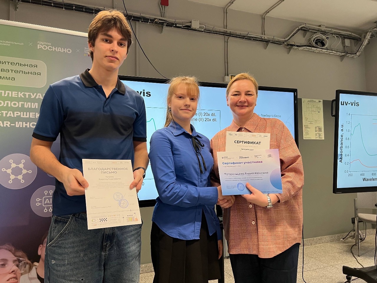 Вручали Лиде именной сертификат ее наставник Чухров Кирилл Георгиевич и Скорб Екатерина Владимировна, доктор химических наук, профессор Университета ИТМО, директор Научно-образовательного центра мирового уровня «Инфохимия».