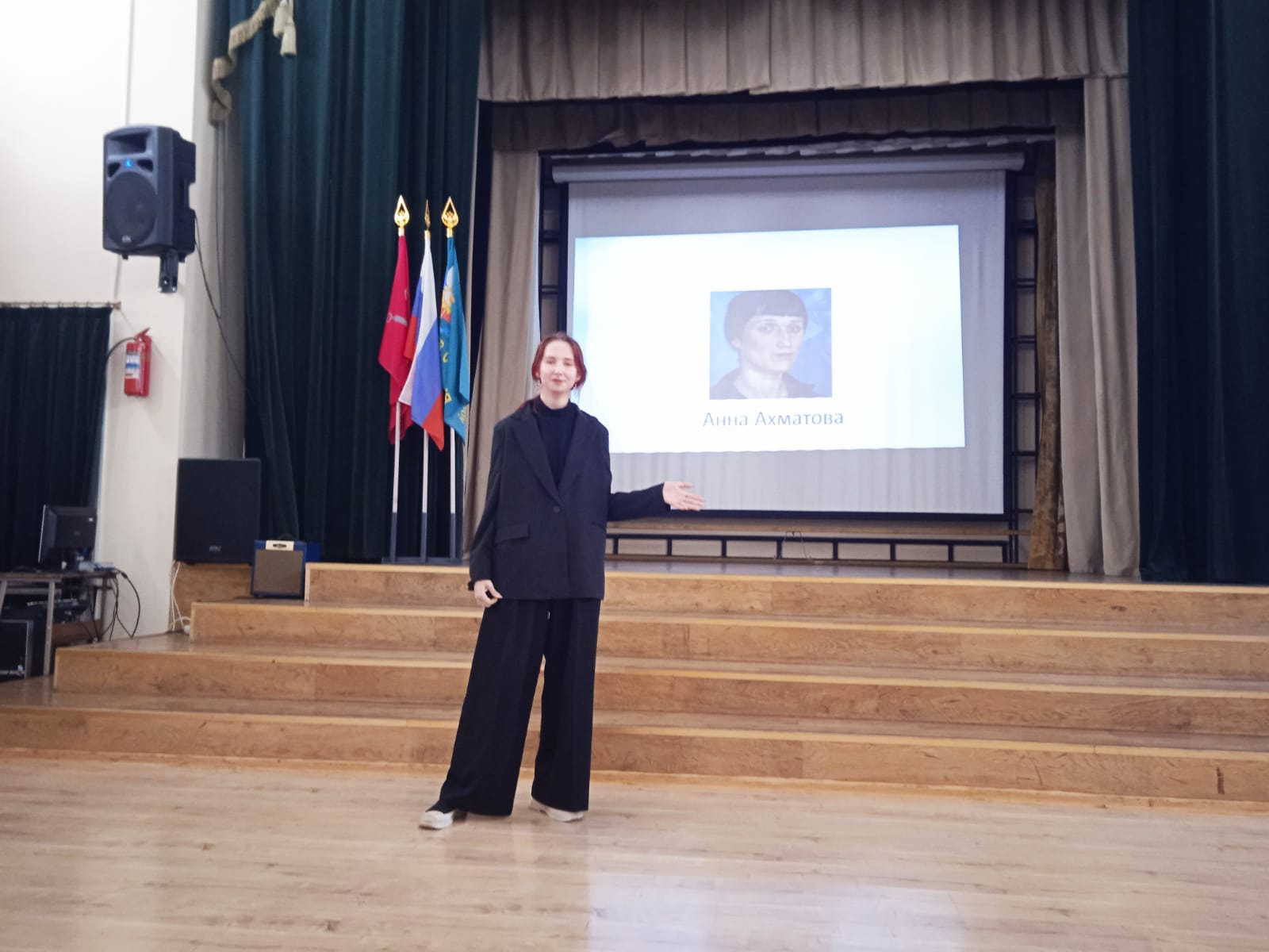 И, конечно же, поразили гимназисты, читавшие стихотворения поэтов того времени: Ненно Ева (8а класс), Захаров Георгий (9а класс), десятиклассницы Федорова Полина, Репинская Олеся, Бочарова Арина, Кочурова Марина, Урвачева-Уман Алиса.