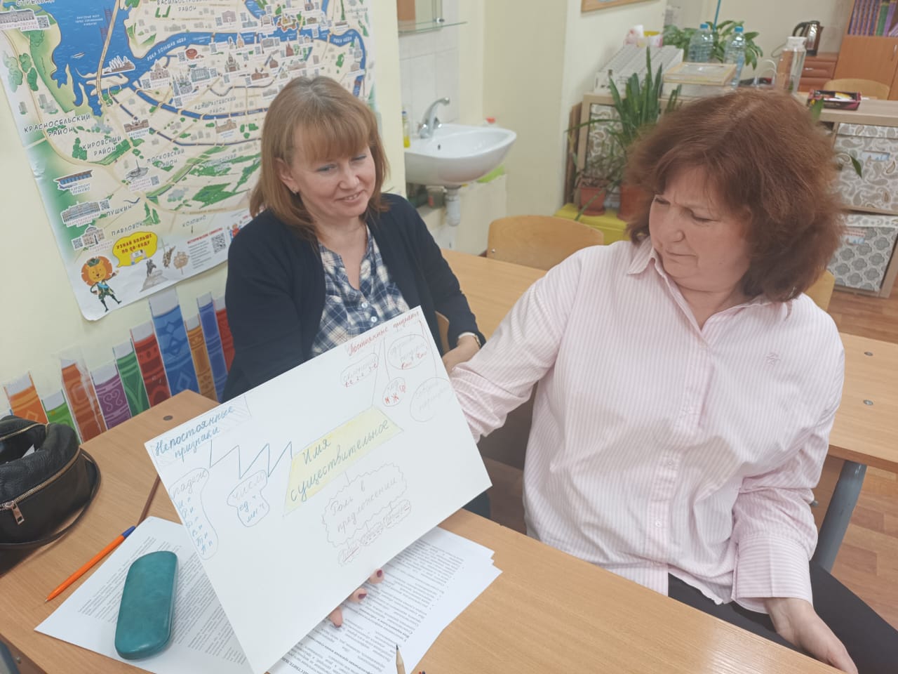 За время работы практикума учителя обсудили важные теоритические вопросы, связанные с написанием сочинений и изложений на уроках русского языка. Остапенко Ирина Александровна, учитель 2а класса, выступила с презентацией педагогического опыта и рассказала об особенностях составления текста-рассуждения и текста по картине в начальной школе. Иванова Ксения Андреевна, учитель 2б класса, провела практическую часть методического практикума. Учителям было предложено составить интеллект-карты по частям речи.