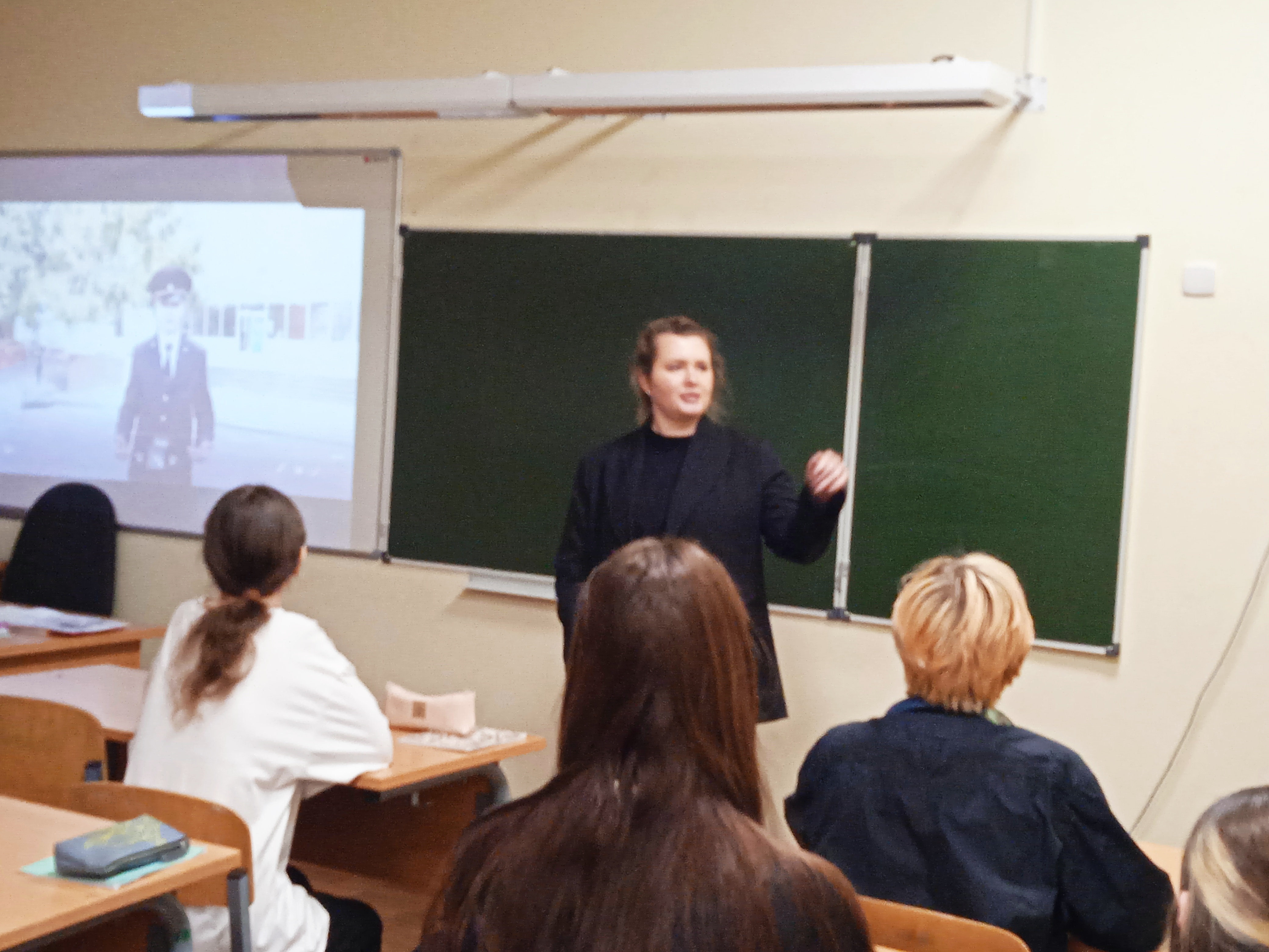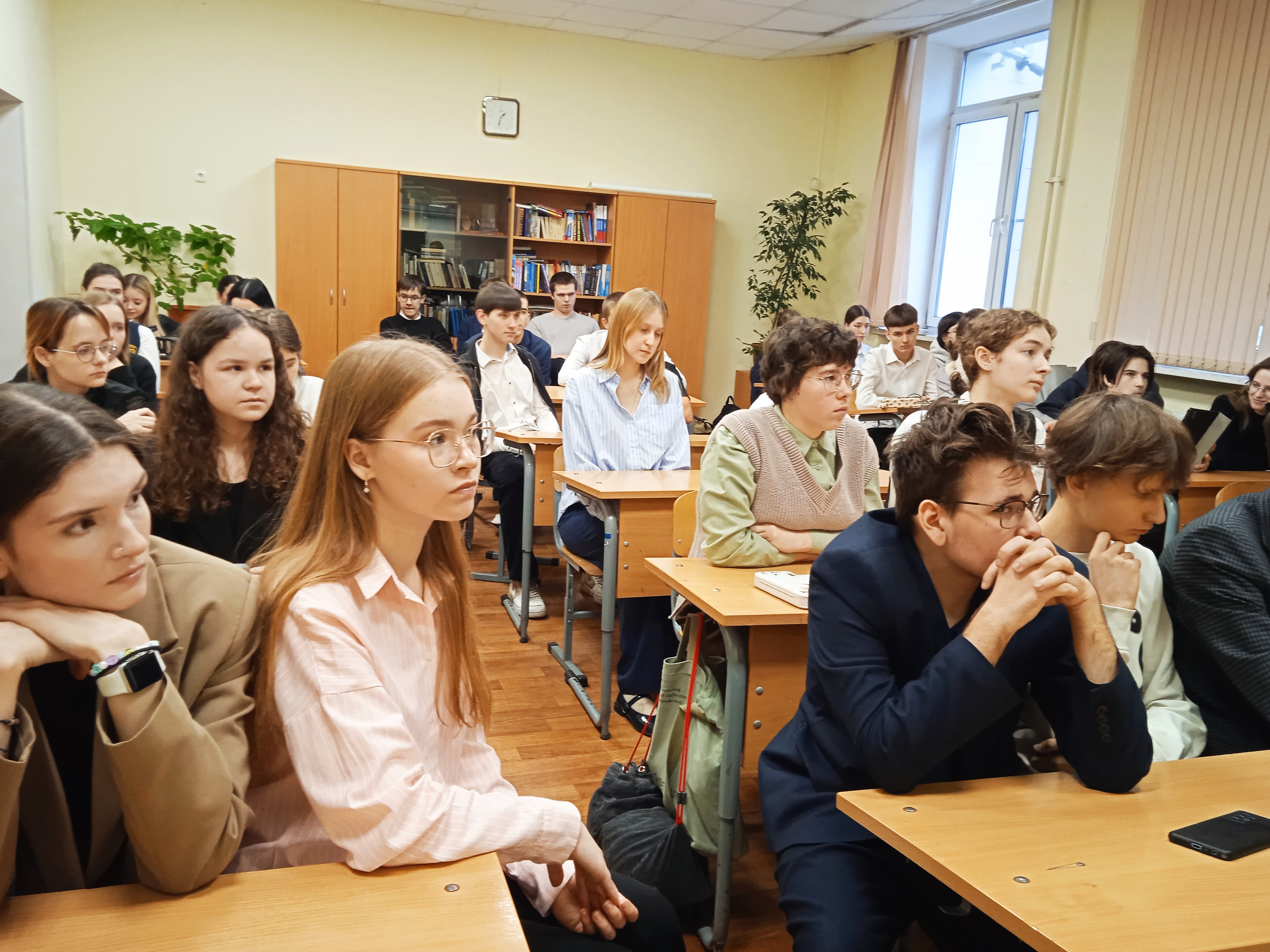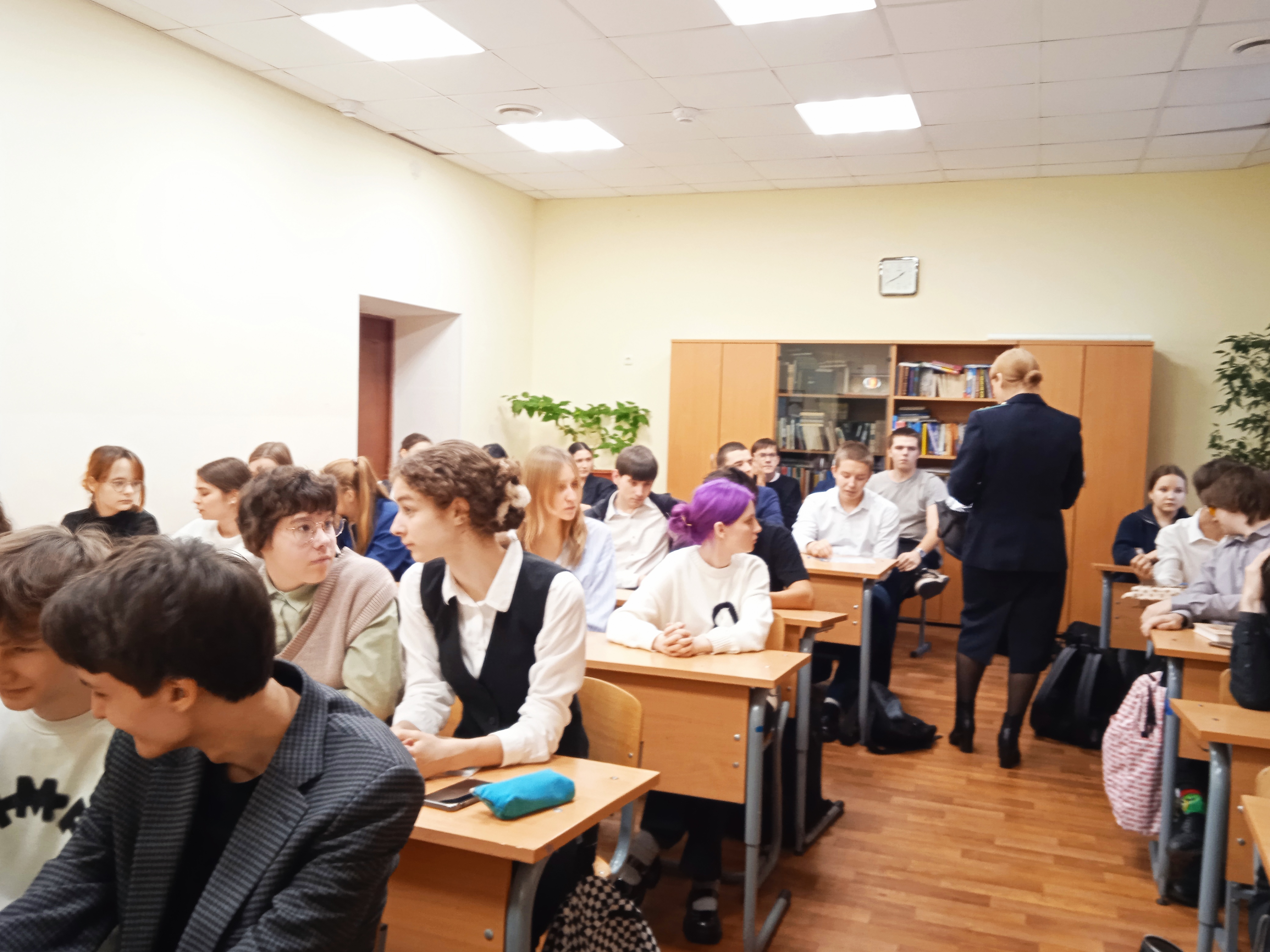 Сотрудник пограничного контроля Федеральной службы безопасности РФ рассказала одиннадцатиклассникам о поступлении в Санкт-Петербургский Институт ФСБ России, подробно ознакомила гимназистов с условиями и требованиями поступления, образовательными программами, а также с перспективами службы в системе ФСБ РФ. Она рассказала гимназистам об этапах прохождения профессионального психологического отбора и ответила на все интересующие вопросы, которые задавали выпускники.